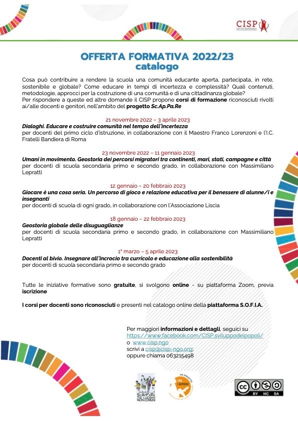The CISP 2022/2023 catalogue includes 5 courses for teachers, aimed at exploring and managing a number of educational challenges, from the commitment to building community in and around the classroom, to the wellbeing of pupils and teachers, to didactic proposals to facilitate the understanding of global phenomena with a strong local impact such as migration and inequality, to the enhancement of sustainable curricula.